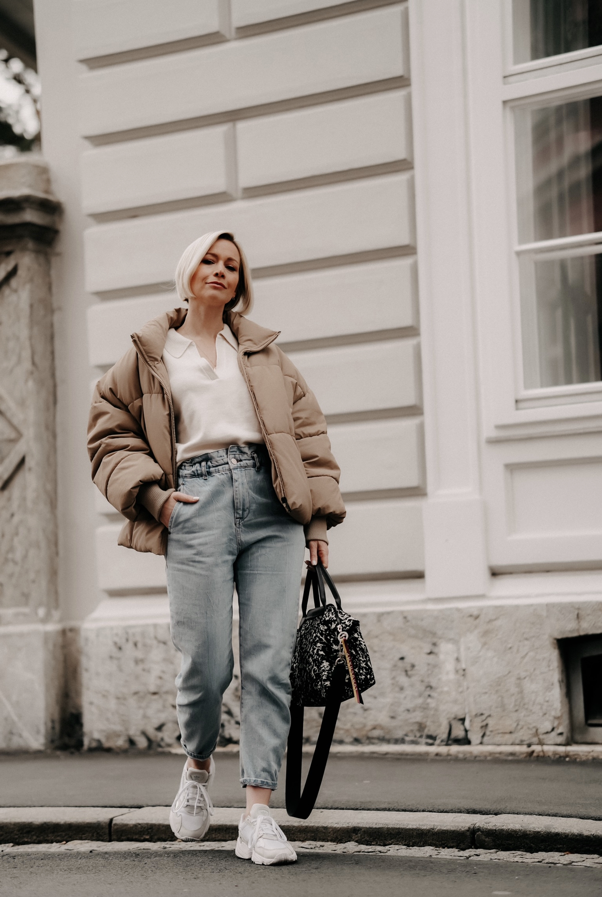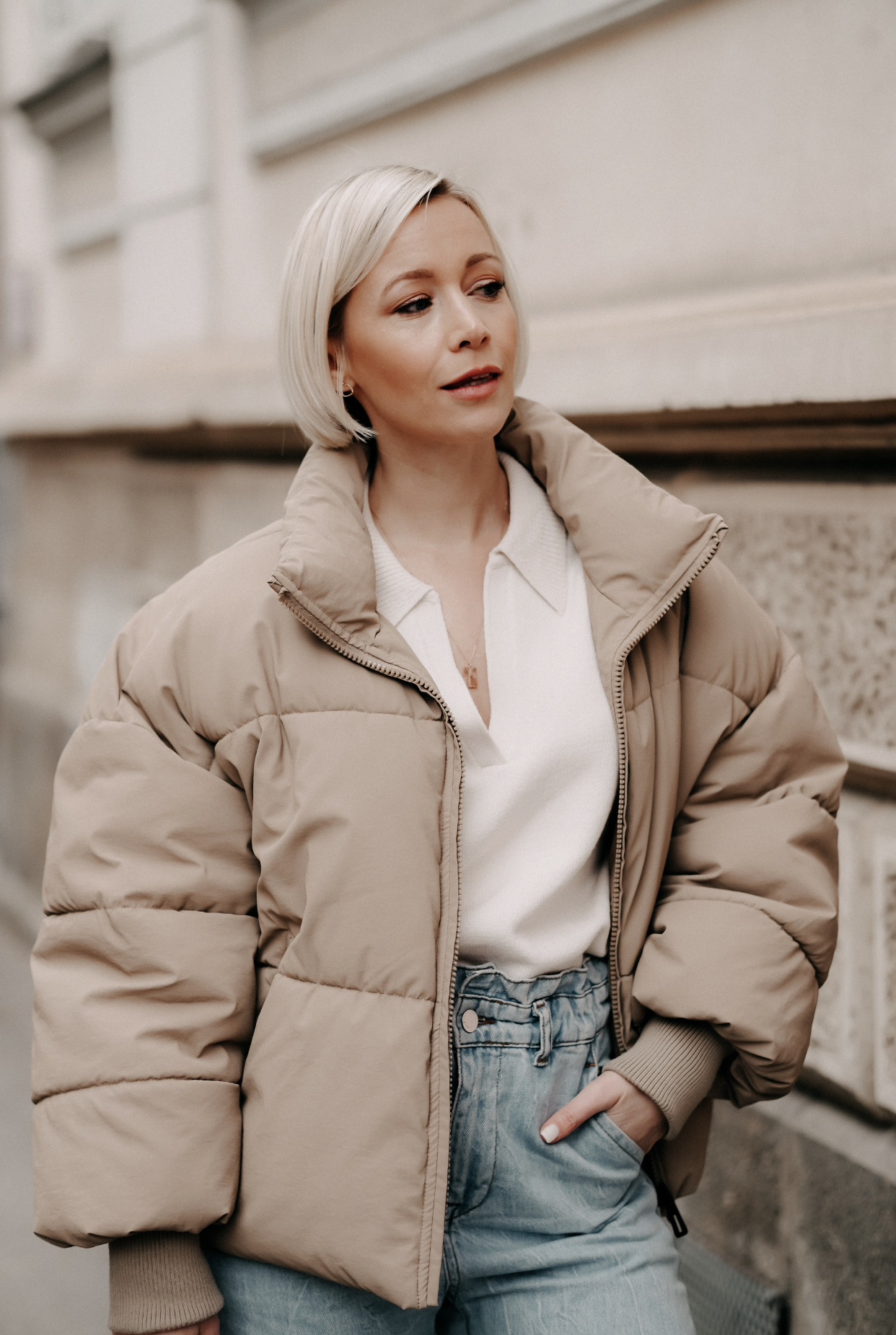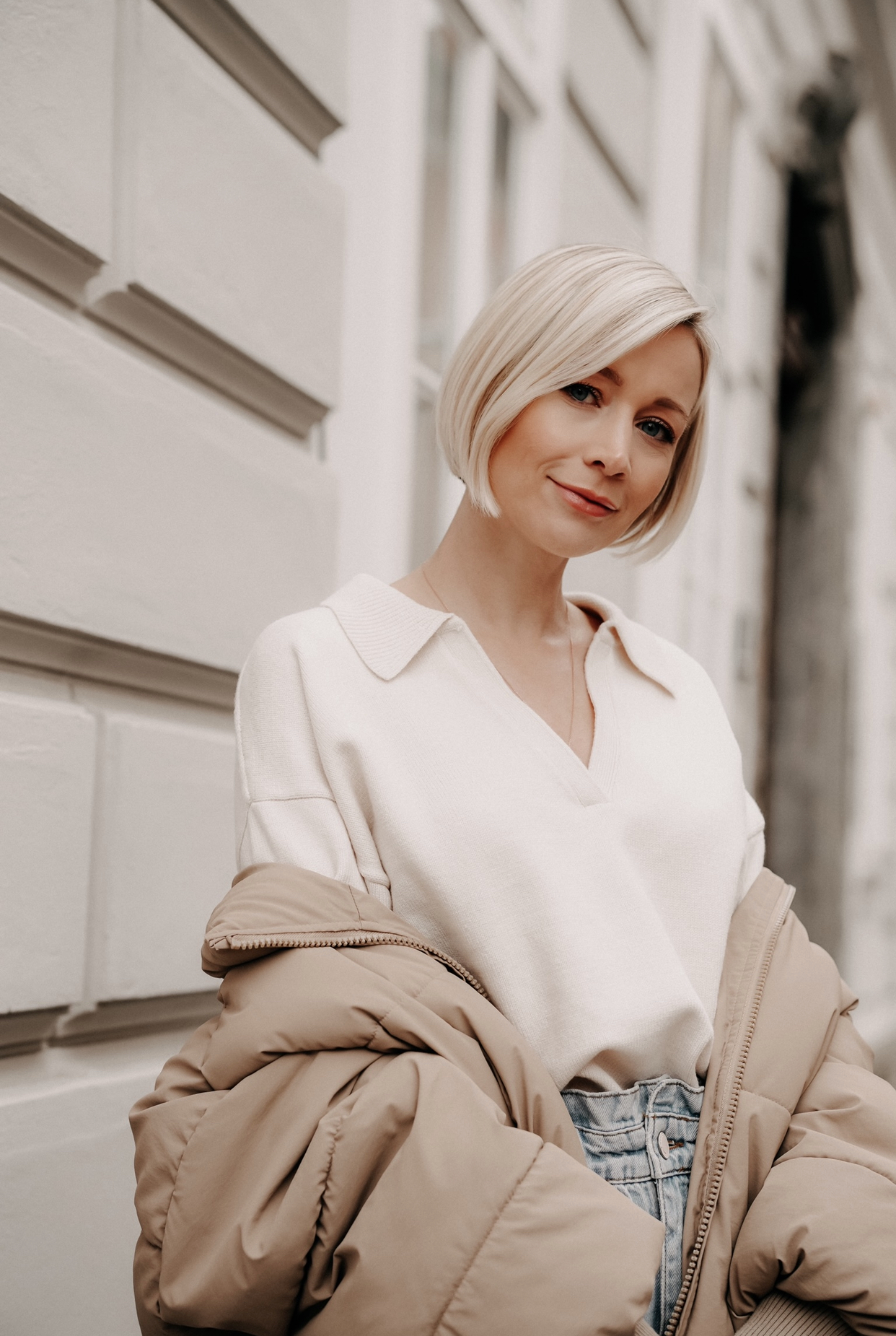 Fashion-Dilemma: 6400 Google-Suchen später bin ich immer noch nicht schlauer, wie dieser Pulloverschnitt heißen könnte, aber irgendwer im Mode-Zirkus wird sich sicher bald einen schicken Namen dafür einfallen lassen. Denn er flimmert gerade so oft über meinen Instagram Screen wie sonst nur Kylie Jenner. Nein, es ist nicht der Dad Sweater (mit Zip!) und auch kein Ugly Sweater, er fällt auch nicht unter die Kategorie Chunky Knits und ist auch kein Cropped Hoodie. Genau genommen hat er auch keinen Polokragen, denn ihm fehlt die Knopfleiste. Eigentlich ist er ein guter alter Pulli mit V-Ausschnitt und einem stinknormalen Umlegekragen. Nicht mal Zara hat einen Namen für Seinesgleichen: Weicher Strickpullover in gebrochenem Weiß… ähm – gähn. Aber irgendwie passt diese unaufdringliche Bezeichnung ganz gut zu ihm. Er ist soft, er schmiegt sich sanft an und ist ein netter Begleiter zur Jeans, Röcken, unter dem Blazer… kurz im Alltag kann man sich richtig gut auf ihn verlassen. Hier eine von vielen Arten, um ihn zu kombinieren.