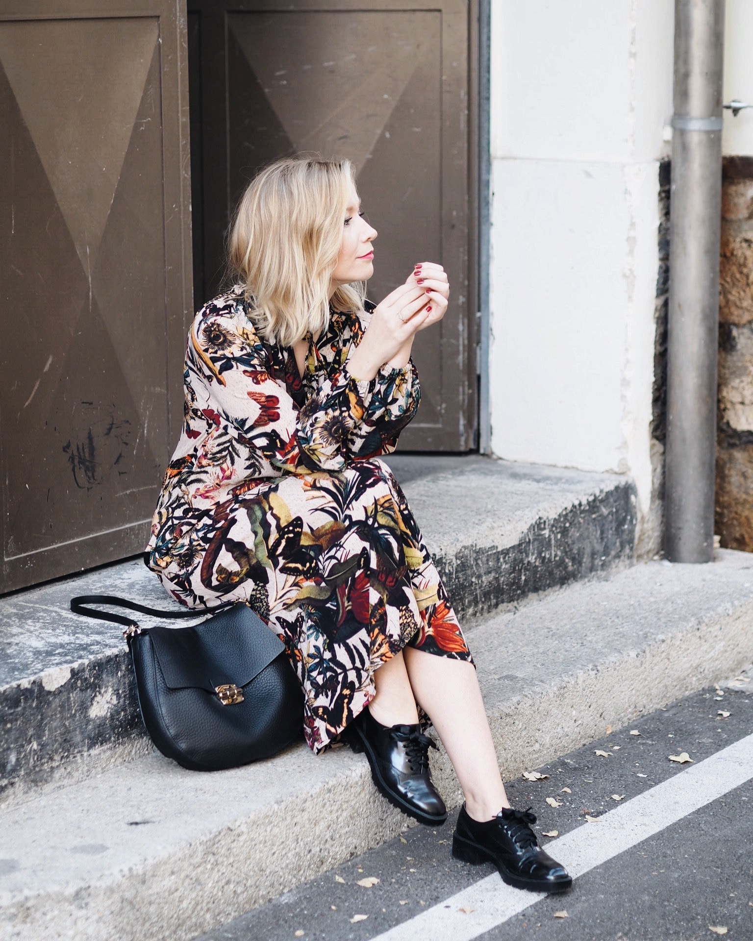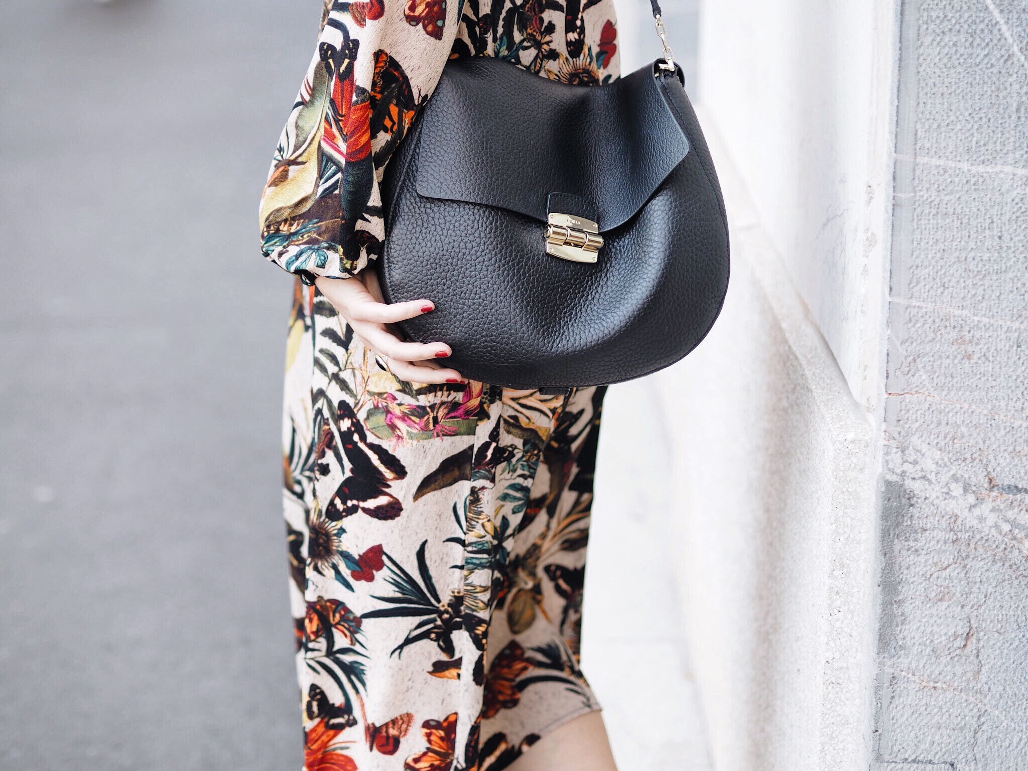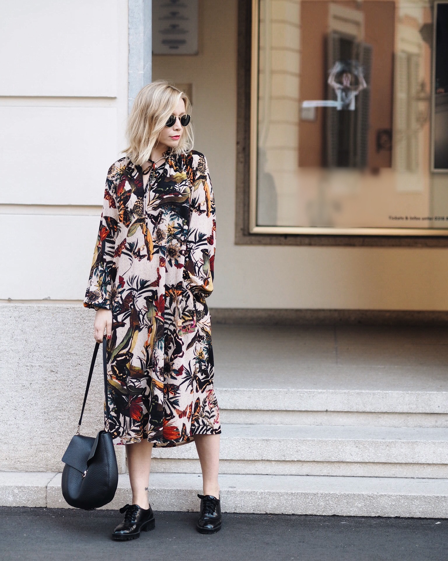 Recently I stumbled upon this gorgeous dress when I was actually on a little raid for a warm jacket. Honestly, I simply could not resist: I cast aside all my good intentions and just went for it. I mean, HOW beautiful is this jungle flower dress? I combined it with my new favorite FURLA CLUB bag and some lacquered bluchers. The best thing about these new midi dresses? Although you just throw one over without caring too much about your outfit, the result is always impeccable. Combine this dress with cool sneakers or ankle boots, an oversized hoodie or your favorite checked blazer and make it a statement piece for fall. Have a nice start to your week!