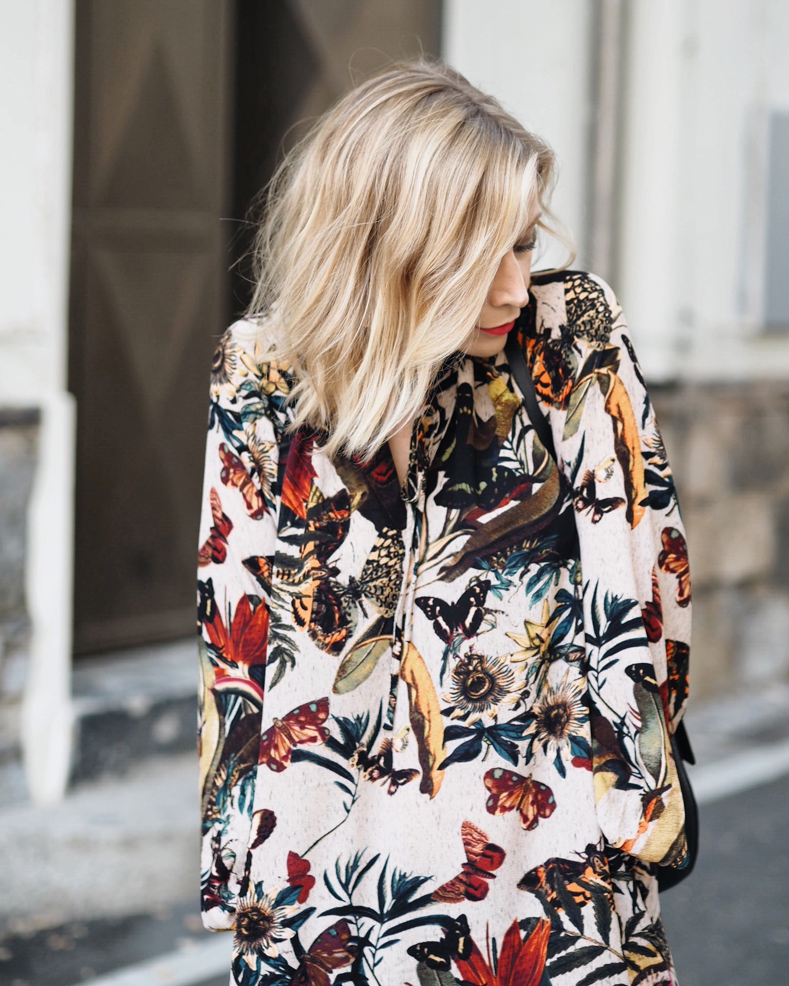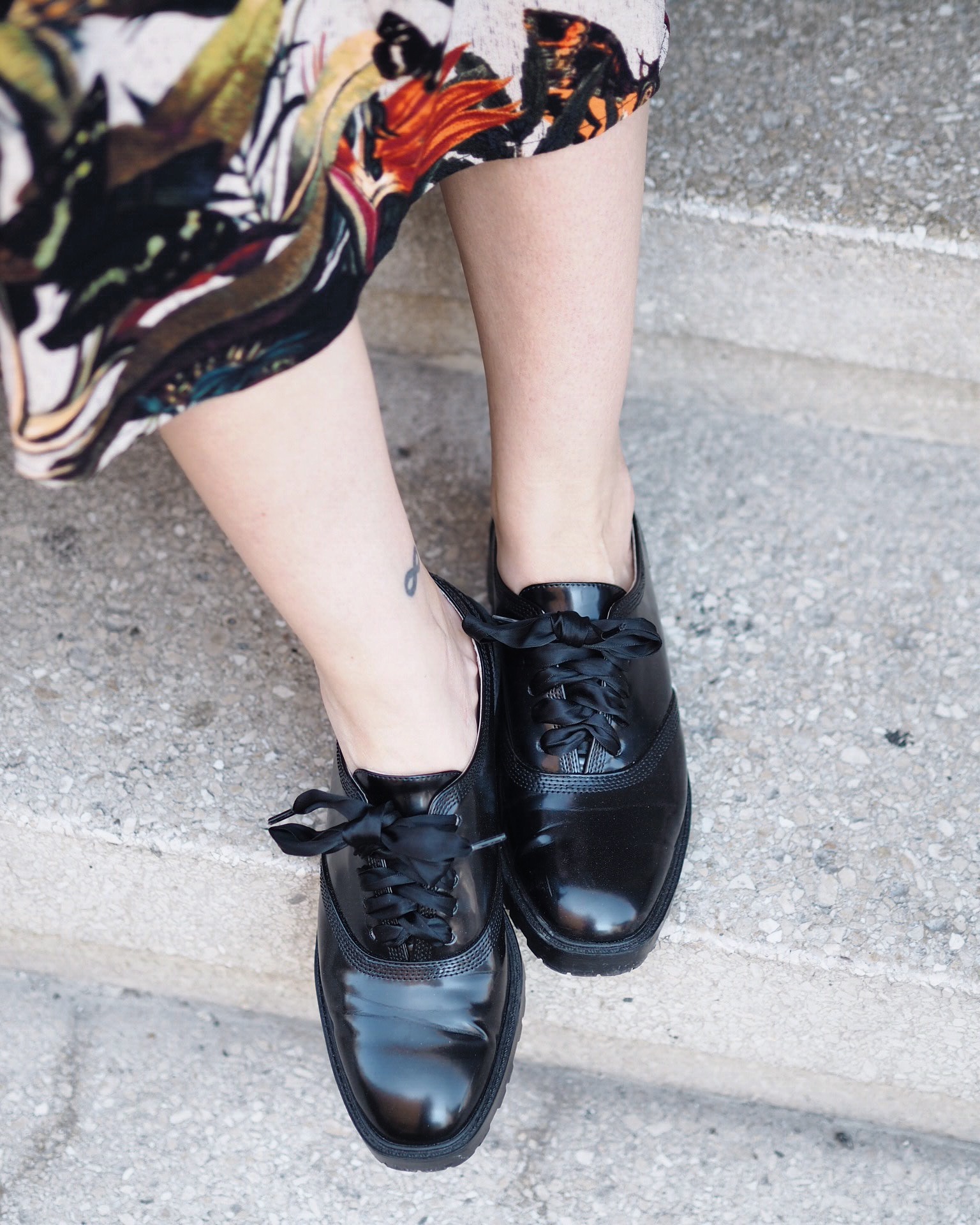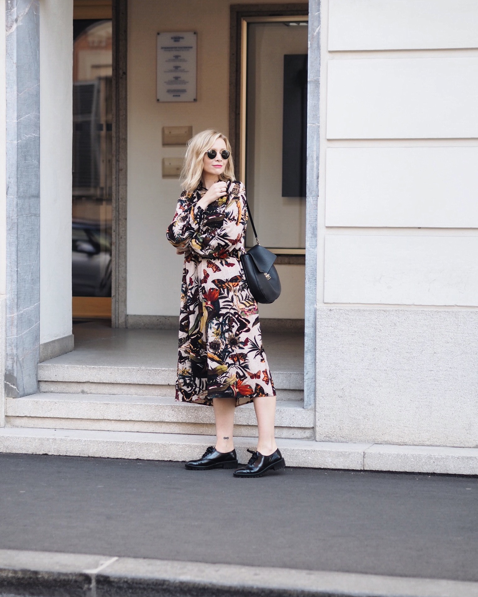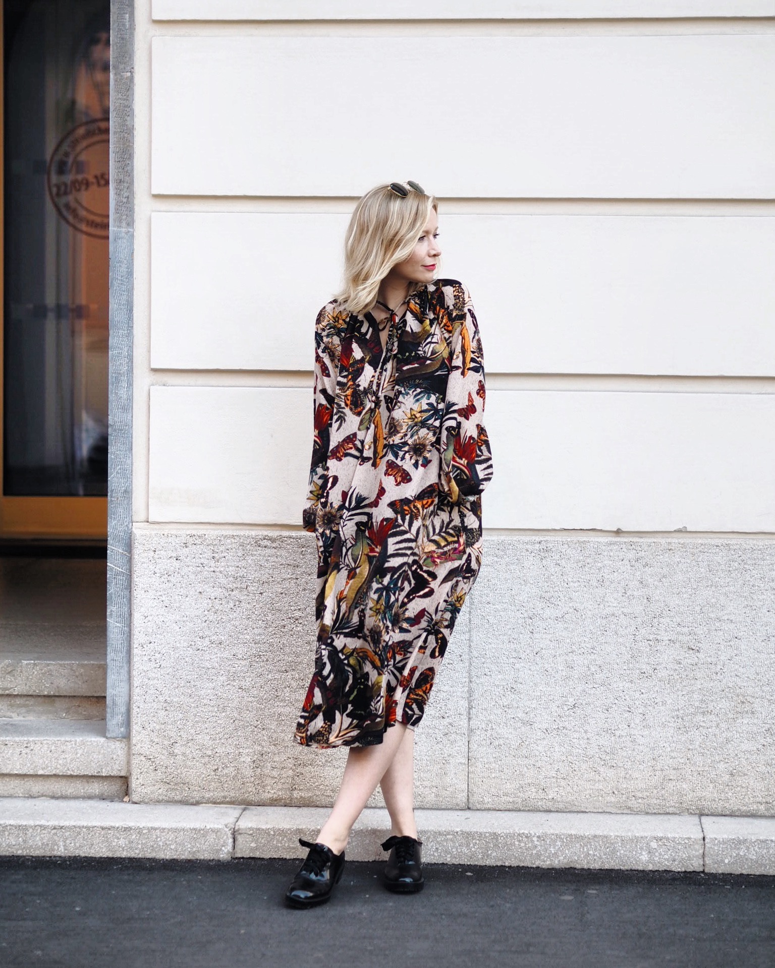 Recently I stumbled upon this gorgeous dress when I was actually on a little raid for a warm jacket. Honestly, I simply could not resist: I cast aside all my good intentions and just went for it. I mean, HOW beautiful is this jungle flower dress? I combined it with my new favorite FURLA CLUB bag and some lacquered bluchers. The best thing about these new midi dresses? Although you just throw one over without caring too much about your outfit, the result is always impeccable. Combine this dress with cool sneakers or ankle boots, an oversized hoodie or your favorite checked blazer and make it a statement piece for fall. Have a nice start to your week!