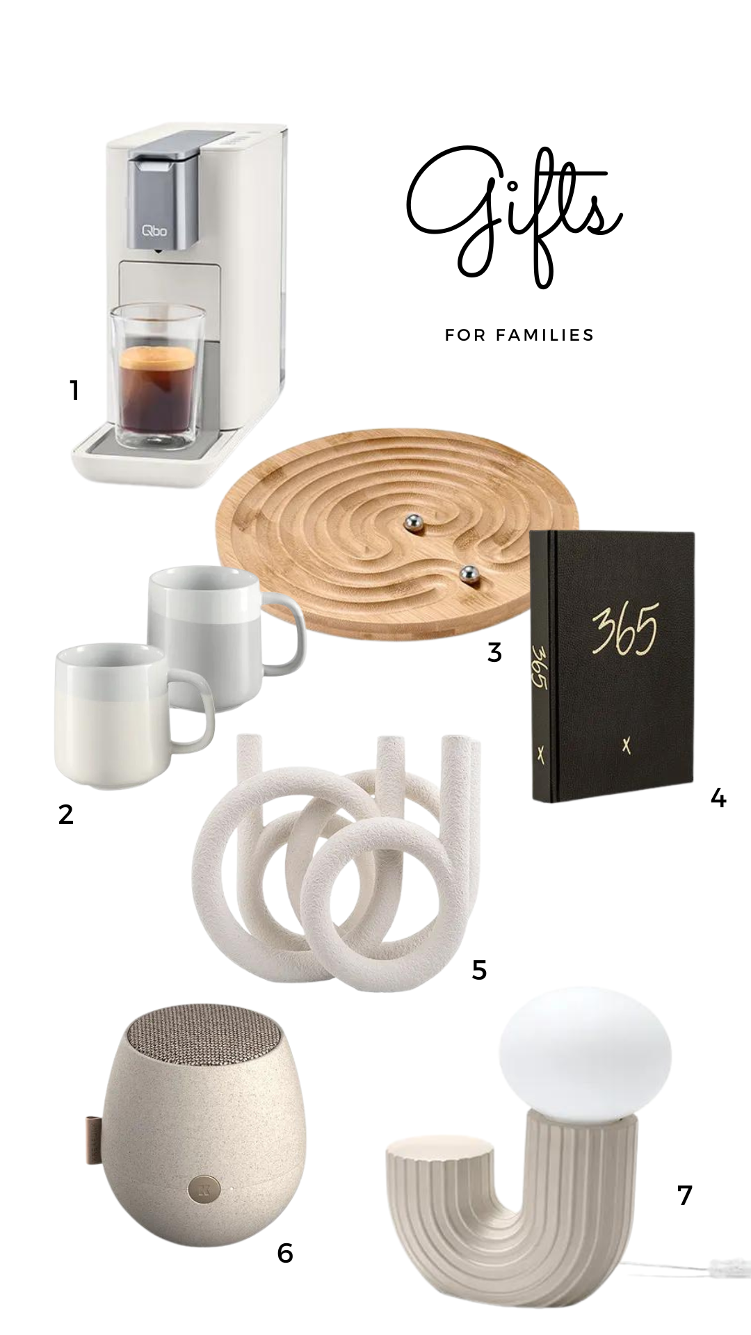 1 Qbo Essential / 2 Kaffeebecher-Set / 3 Spiel / 4 Notizbuch