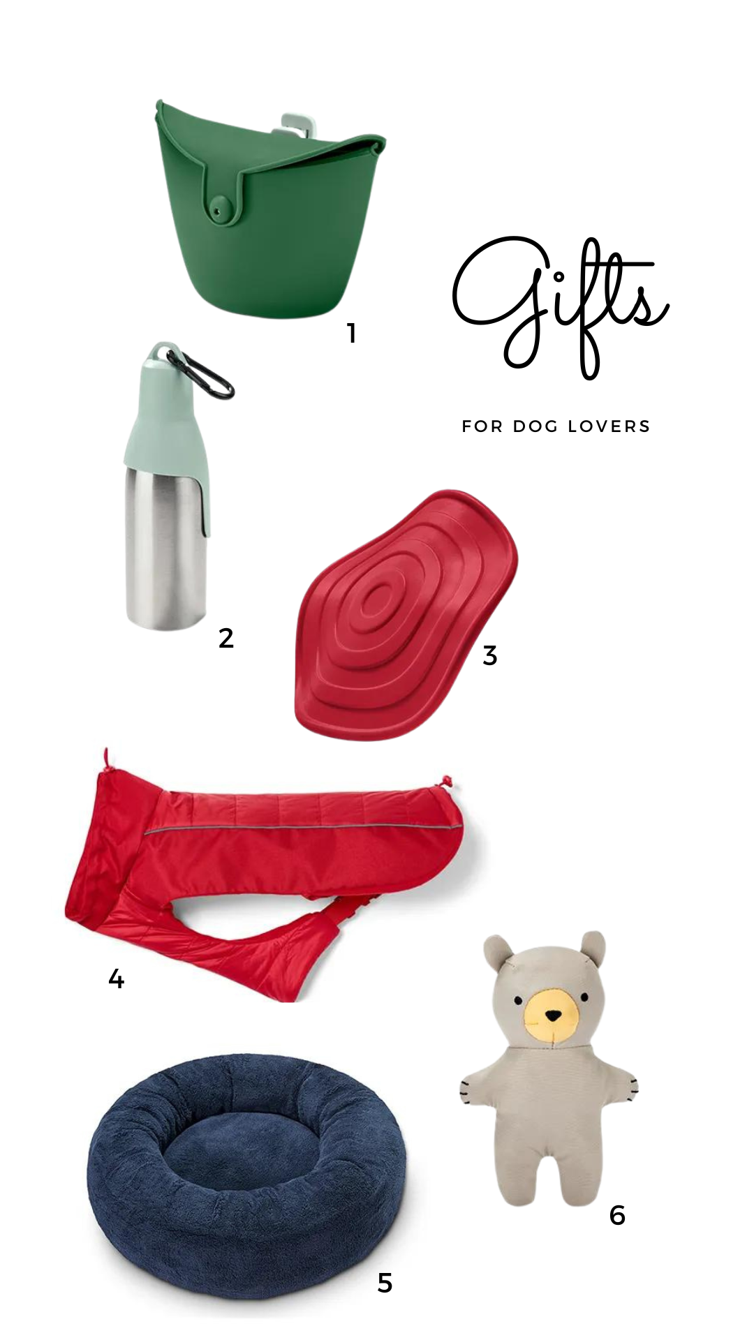 1 Leckerli-Tasche / 2 Trinkflasche mit Trinkschale / 3 Wurfscheibe / 4 Hundejacke