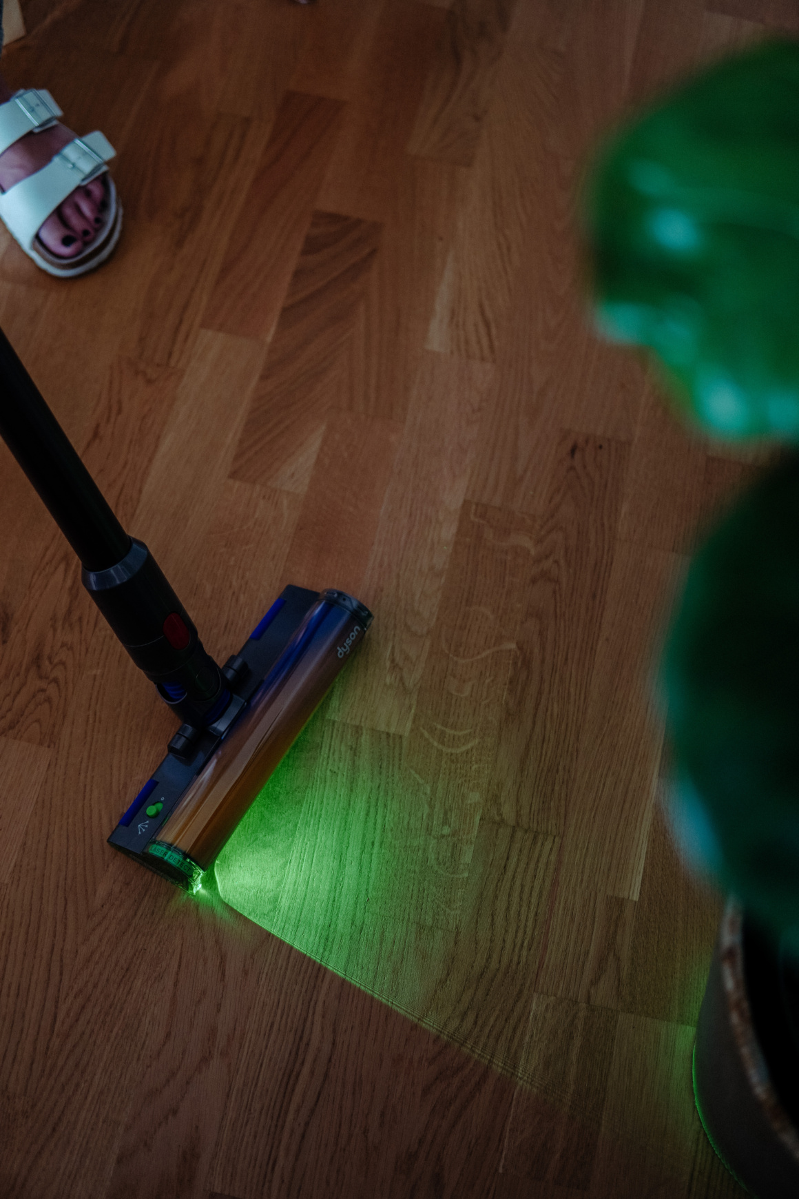 Dieser Blogpost hat in der Vorbereitung etwas länger gedauert als normal, aber dafür kann ich tatsächlich nichts: Der V15 hält uns ganz schön auf Trab! Warum? Er findet wirklich jedes noch so kleine Staubkrümelchen dank der neuen Laser-Erkennungstechnologie und zerlegt den Staub in seine Einzelteile. Damit wird sogar versteckter Staub bis zu einer Größe von 10 Mikrometern erkennbar. Ich will nicht zu wissenschaftlich werden: Glaubt mir, man sieht die Staub-Welt mit anderen Augen. Dank Piezo Sensor wird eine Tiefenreinigung ermöglicht: Der LCD Bildschirm gibt Aufschluss über die Größe und Menge der eingesaugten Partikel. Dahinter steckt ein akustischer Sensor, der winzige Vibrationen der Partikel in elektrische Signale umwandelt und so Staub „messbar” macht.