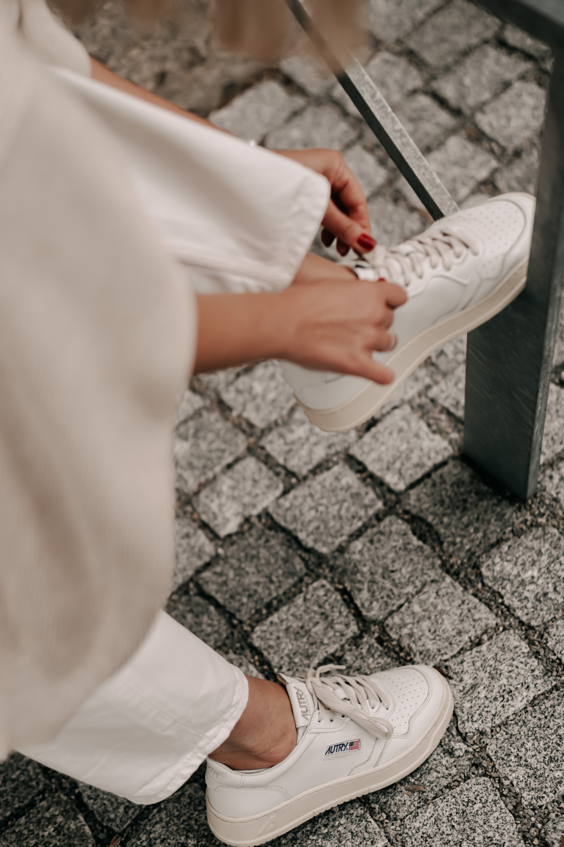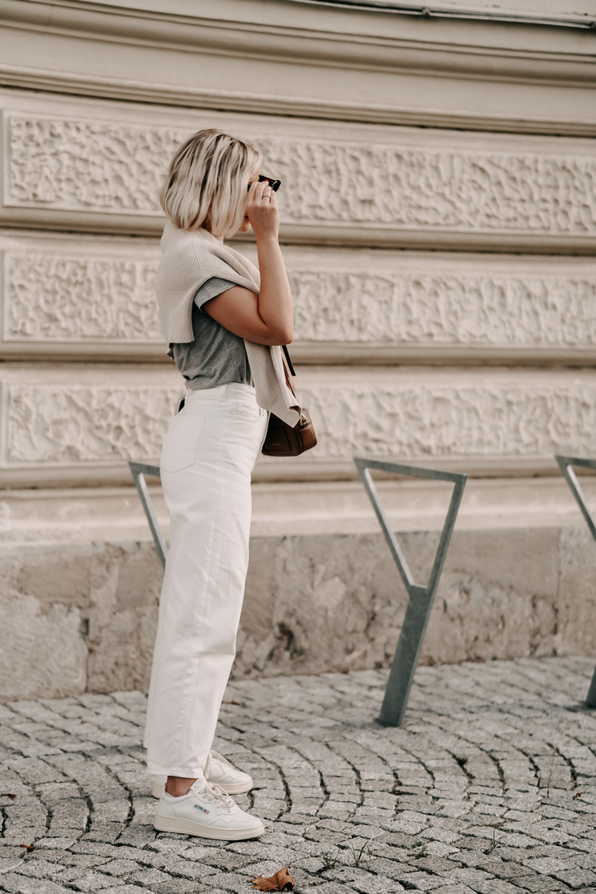Fast schon ein Klassiker – mein Sneakers Guide für den Herbst. Wann, wenn nicht jetzt in ein neues Paar investieren, wenn die Sandalen langsam aber sicher zu frisch werden? Ich habe dieses Jahr schon im Sommer ein Auge auf ein Paar Medalist Sneakers von Autry geworfen und mir die neuen Lieblinge in Off-White zugelegt. Die Marke erlebt ja gerade ein riesengroßes Comeback und das zu Recht: Effortless & chic passen sie quasi zu allem in der Garderobe. Wer den 80er-Jahre Look à la Lady Di feiert, wird ohnehin an einem Paar Tennis Sneakers nicht vorbei kommen und dann lohnt sich die Investition in einen hochwertigen Klassiker. Wer optisch mithalten kann? Der Reebok Club C 85, der Saye Modell ’89 oder der CPH461 von Copenhagen. Aber das war noch nicht alles: Neben den Retro-Modellen halten sich im Herbst die Dad Sneakers unseres Vertrauens. We See you New Balance 530 und Adidas Ozweego. Übrigens: Den vielleicht populärsten New Balance Schuh und die Details zu meinem minimalistischen Weekend Look habe ich weiter unten für euch verlinkt. Kleine Notiz am Rande. Perfektes T-Shirt gefunden. Fabelhafter Schnitt, nachhaltig und preislich auch mehr als ok. Viel Spaß beim Entdecken meines Outfits und der It-Sneakers der Saison.