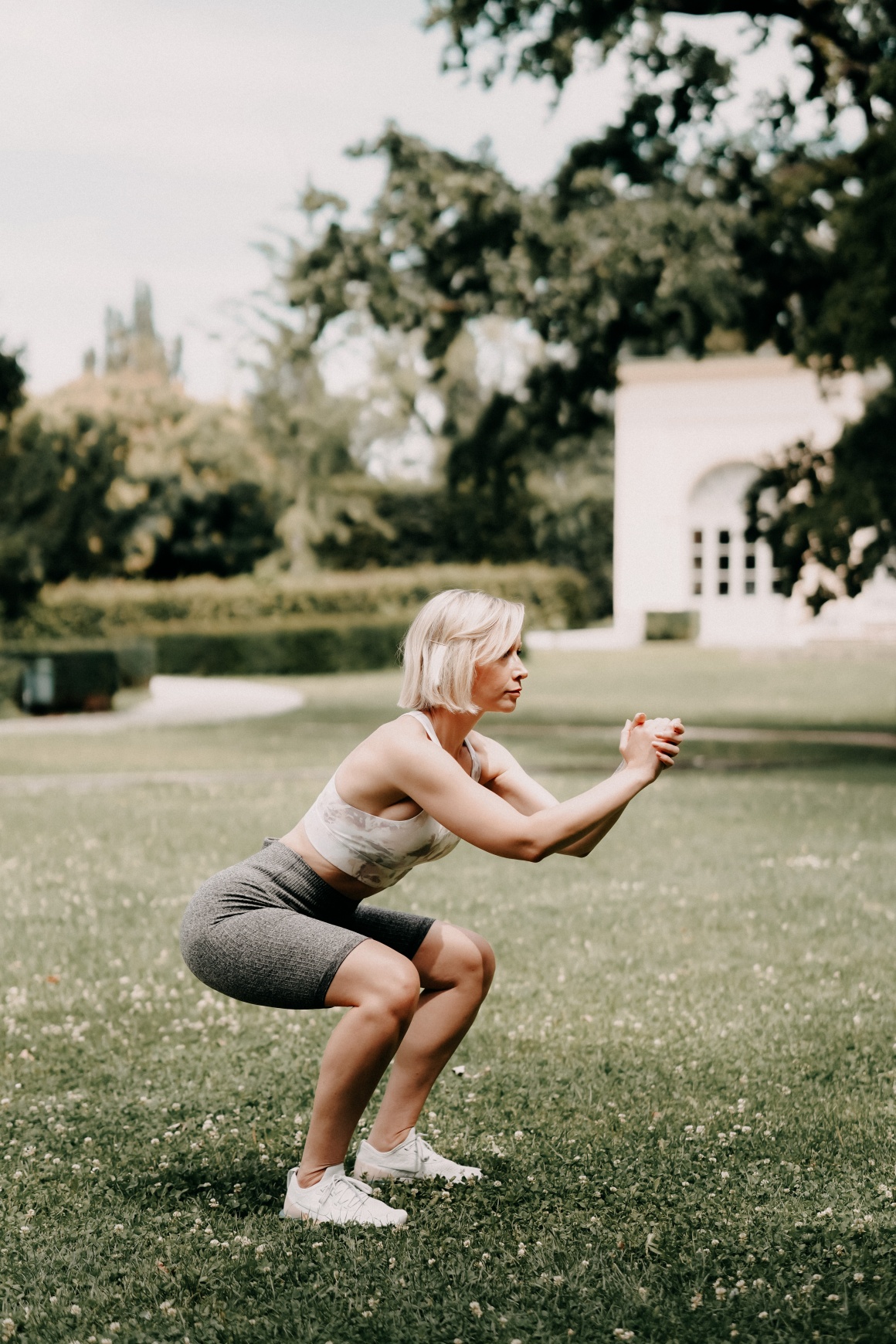 Im aufrechten Stand sind eure Füße schulterbreit auseinander, die Zehen schauen gerade nach vorne oder leicht nach außen, der Blick ist geradeaus. Während die Brust weiterhin offen ist und nach vorne zeigt, bewegt ihr das Gesäß Richtung Wiese. Dabei ist die Körpermitte, der Bauch angespannt, die Schultern sind weg von den Ohren und der Rücken bleibt gerade. Die Ärme ziehen nach vorne und das Gesäß so weit wie möglich zum Boden. Wichtig: Die Knie kommen keinesfalls über die Zehenspitzen hinaus. Zum Zurückkommen in die Startposition löst ihr die Arme nach hinten und kommt mit starker Mitte wieder hoch in den Stand. Wenn ihr Lust habt und ein bisschen Dampf ablassen wollt, beim Hochkommen laut über den Mund ausatmen.