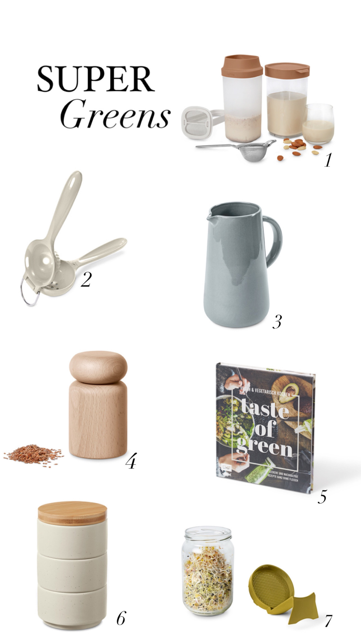 1 Getreide- & Nussmilch-Maker / 2 Zitruspresse /3 Krug / 4 Leinsamenmühle / 5 Buch