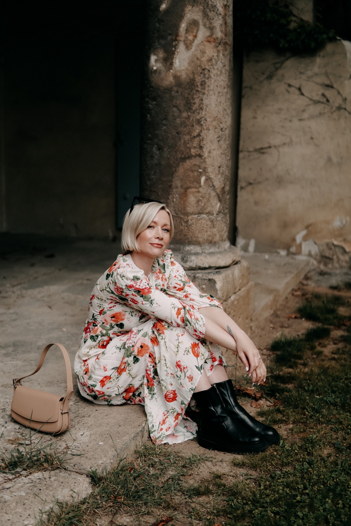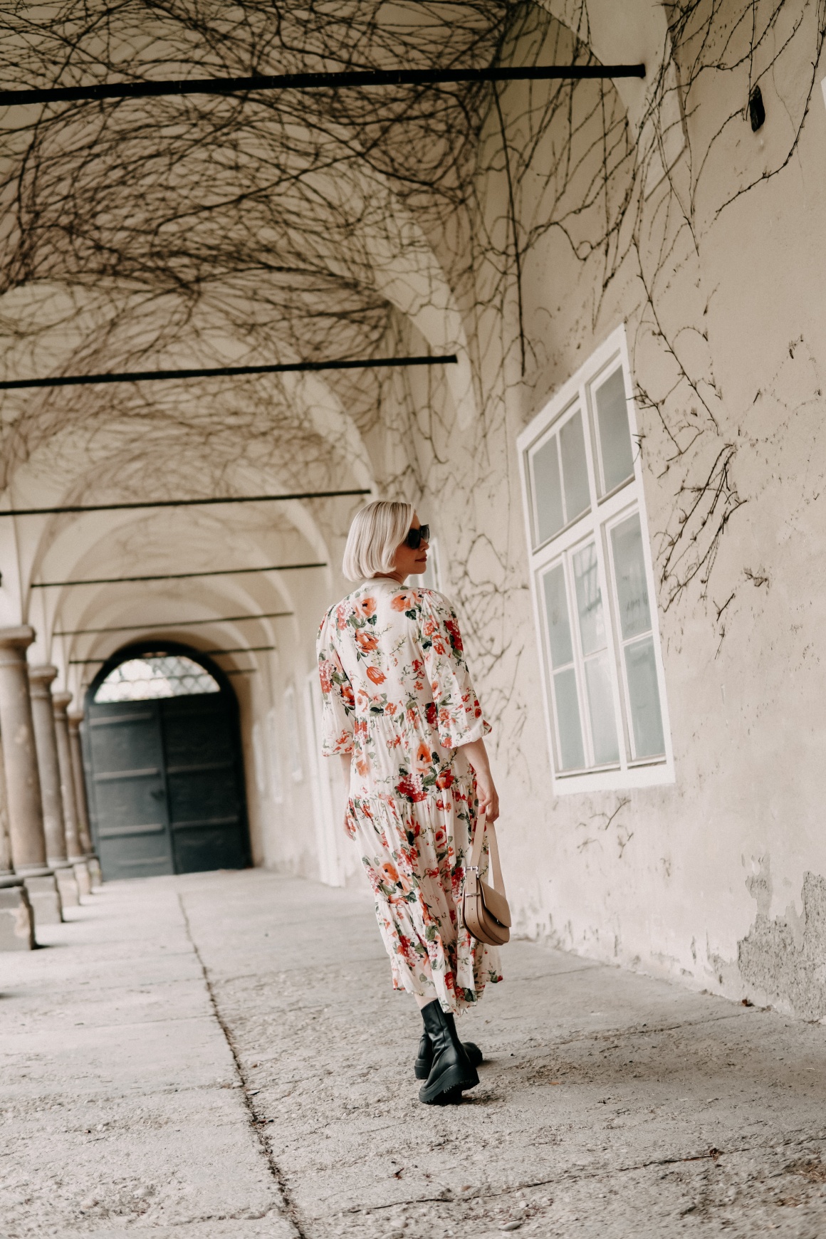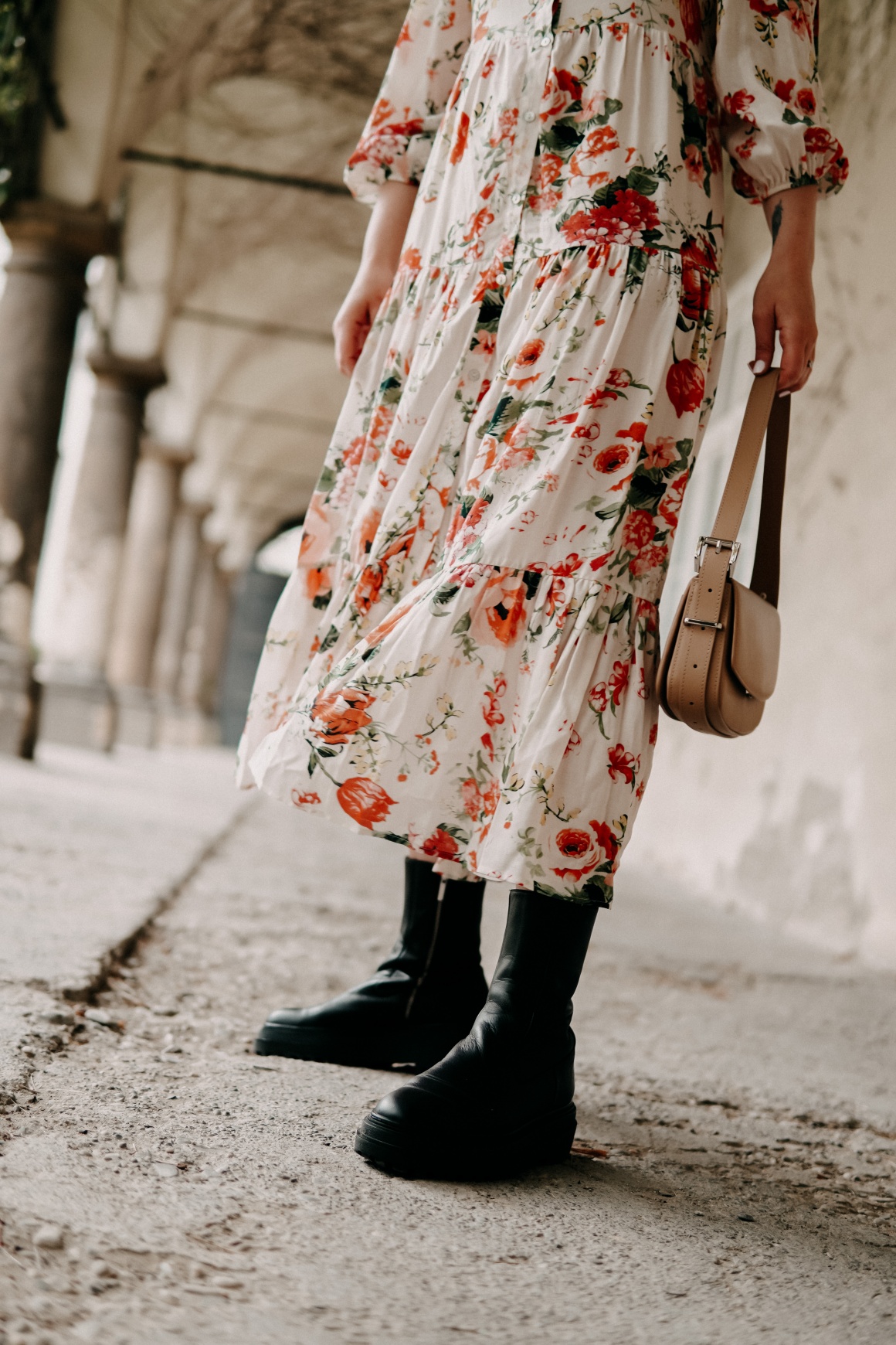Dieses Blumenkleid von Zara hat mich in der vergangenen Woche zu diesem Outfit inspiriert – es hatte mal wieder geregnet und an luftige Sandalen war dank Oktober-Temperaturen auch noch nicht zu denken. Kombiniert habe ich es zu schwarzen Plateau-Stiefeletten und einer Baguette-Bag in Beige. Mein Vorsatz: Für alle Wetter-Eventualitäten gerüstet sein und trotzdem ein feminines, sinnliches Outfit für die ersten schönen Stunden im Post-Lockdown tragen.