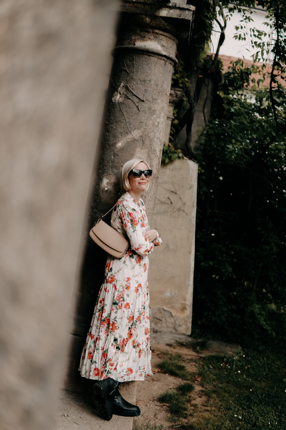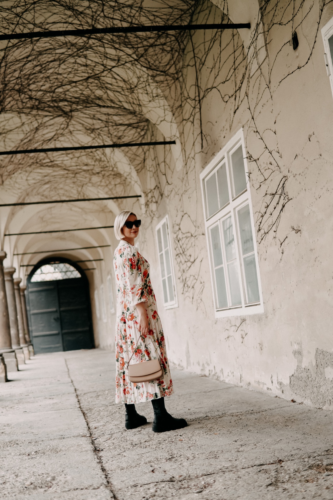 Weißes Kleid mit Blumen-Print: Zara / Cat-Eye-Sonnenbrille mit Acetat Rahmen: Céline / Derbe Boots: Zara (F/W 2019) aktuell ähnlich hier / Ledertasche in Beige: CCC Shoes Bags